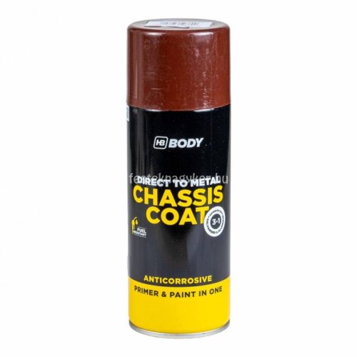 A HB Body Chassis Coat három az egyben termék egy alkid bázisú korróziógátló, alapozó és fedőfesték egyben. Járművek alvázára és mindenféle fémfelület védelmére ajánlott (acél, galván, aluminium, stb). Zink foszfát tartalmának köszönhetően kiváló rozsdagátló. Jól tartja a színét, gyorsan szárad és selyemfényű felületet ad. Megfelelő előkészület után (csiszolás és zsírtalanítás), külön alapozás nélkül közvetlenül – akár a rozsdás (kivéve pergő rozsda) – fémfelületre felvihető. Kiválóan alkalmas otthoni, kültéri (vagy akár beltéri) fémfelületek védelmére is. Pl. kerítés, vaskapu, csatorna, stb. Javasolt a kenhető kiszerelés felhasználása során keletkezett apróbb hibák kijavítására is.